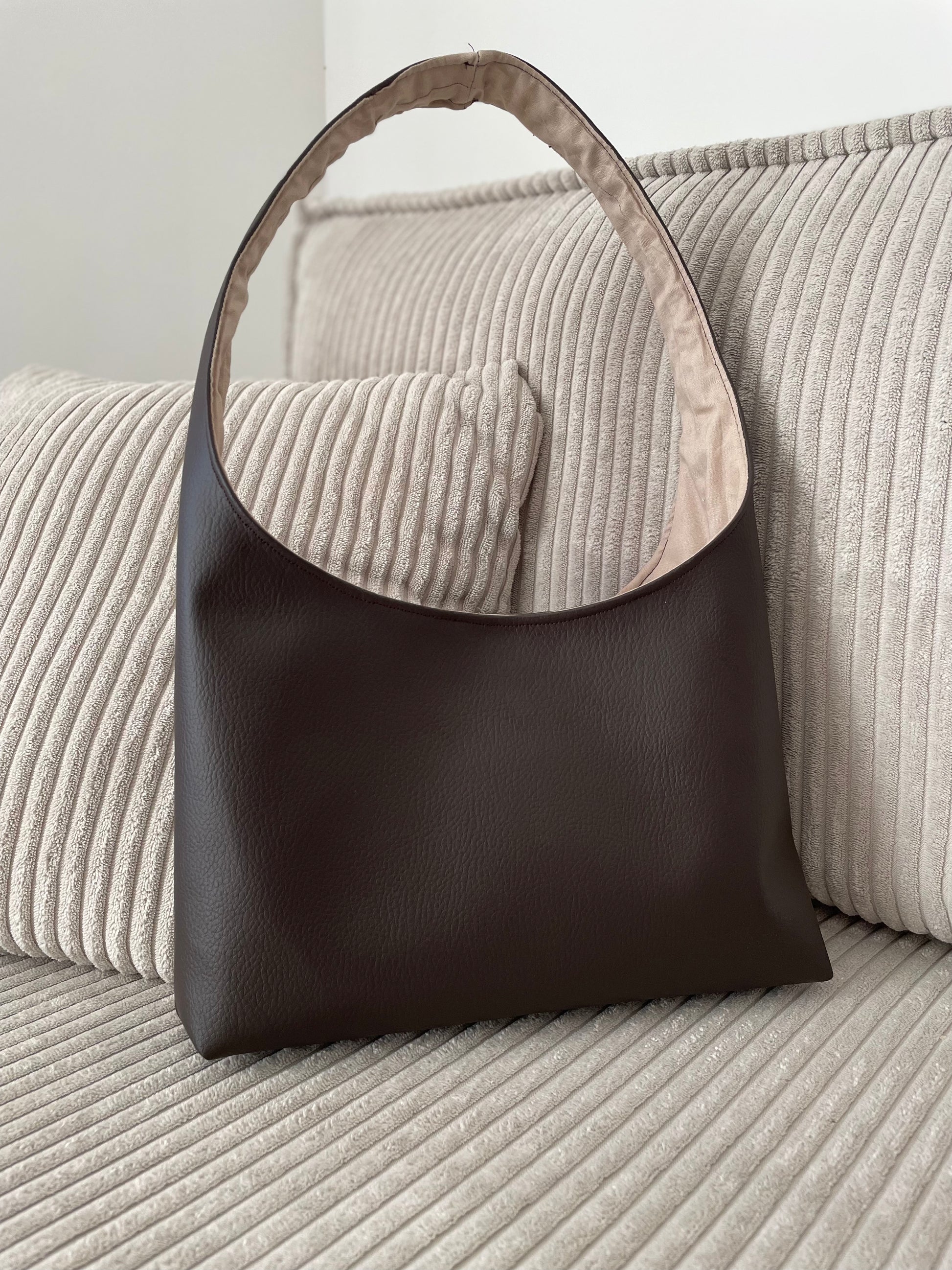 Confectionné à la main dans mon atelier. Le sac Louise est en similicuir texturé marron, doublure en coton beige.
